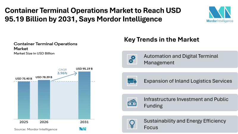 According to Mordor Intelligence, the global container terminal operations market size was valued at USD 75.40 billion in 2025 and is estimated at USD 78.39 billion in 2026, with projections indicating it will reach USD 95.19 billion by 2031 at a CAGR of 3.96%. This steady container terminal operations market growth reflects the essential role ports play in international trade and supply chains. Rising cargo volumes, the expansion of maritime routes, and the arrival of ultra-large container vessels above 18,000 TEU are reshaping how terminals operate worldwide.