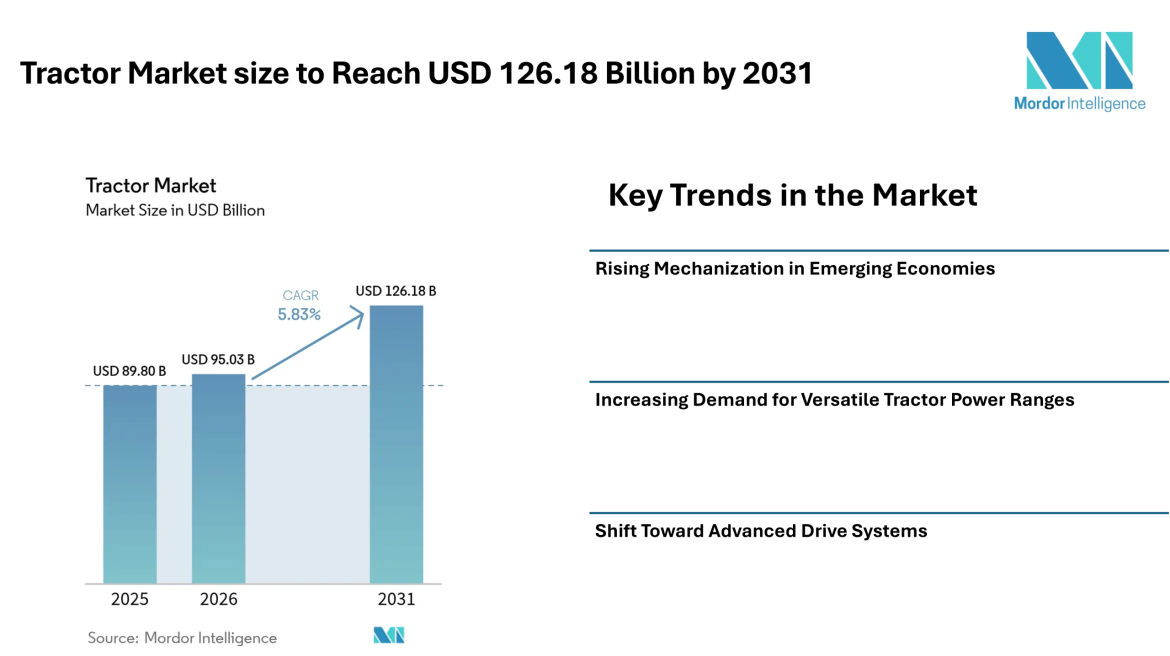 According to Mordor Intelligence, the tractor market size is estimated at USD 95.03 billion in 2026, increasing from USD 89.8 billion in 2025, and is projected to reach USD 126.18 billion by 2031, registering a CAGR of 5.83% during the forecast period.